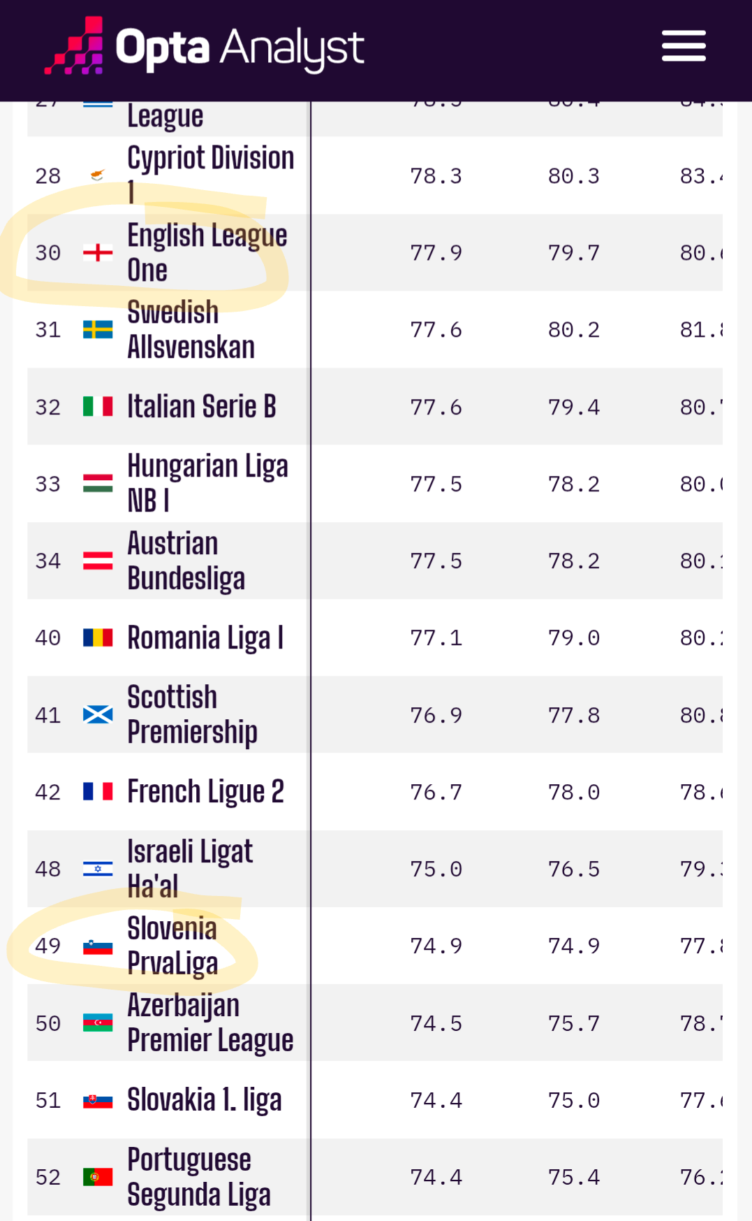 I have long been pushing the Slovenian PrvaLiga as a fertile league for recruitment for the UK leagues. It is the lowest ranked Band 1-5 league from a UEFA coefficient perspective, and in the bottom five in terms of the Opta Analyst league strength rankings.